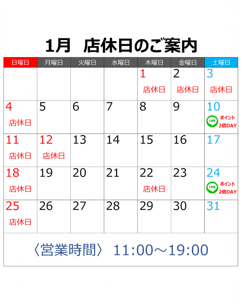 お知らせ 2025.12.26 ◇年末年始休業と1月の営業日・店休日のお知らせ ◇年末年始休業と1月の営業日・店休日のお知らせ◇ 日曜、祝日、第2・第4木曜日が店休日となりますが、1月は年末年始休業があるため変則的となります。 カレンダーをご確認の上ご来店くださいますようお願い申し上げます✨ ============= 今年もスタッフ一同大変お世話になりました。 よいお年をお迎えください(*^-^*)